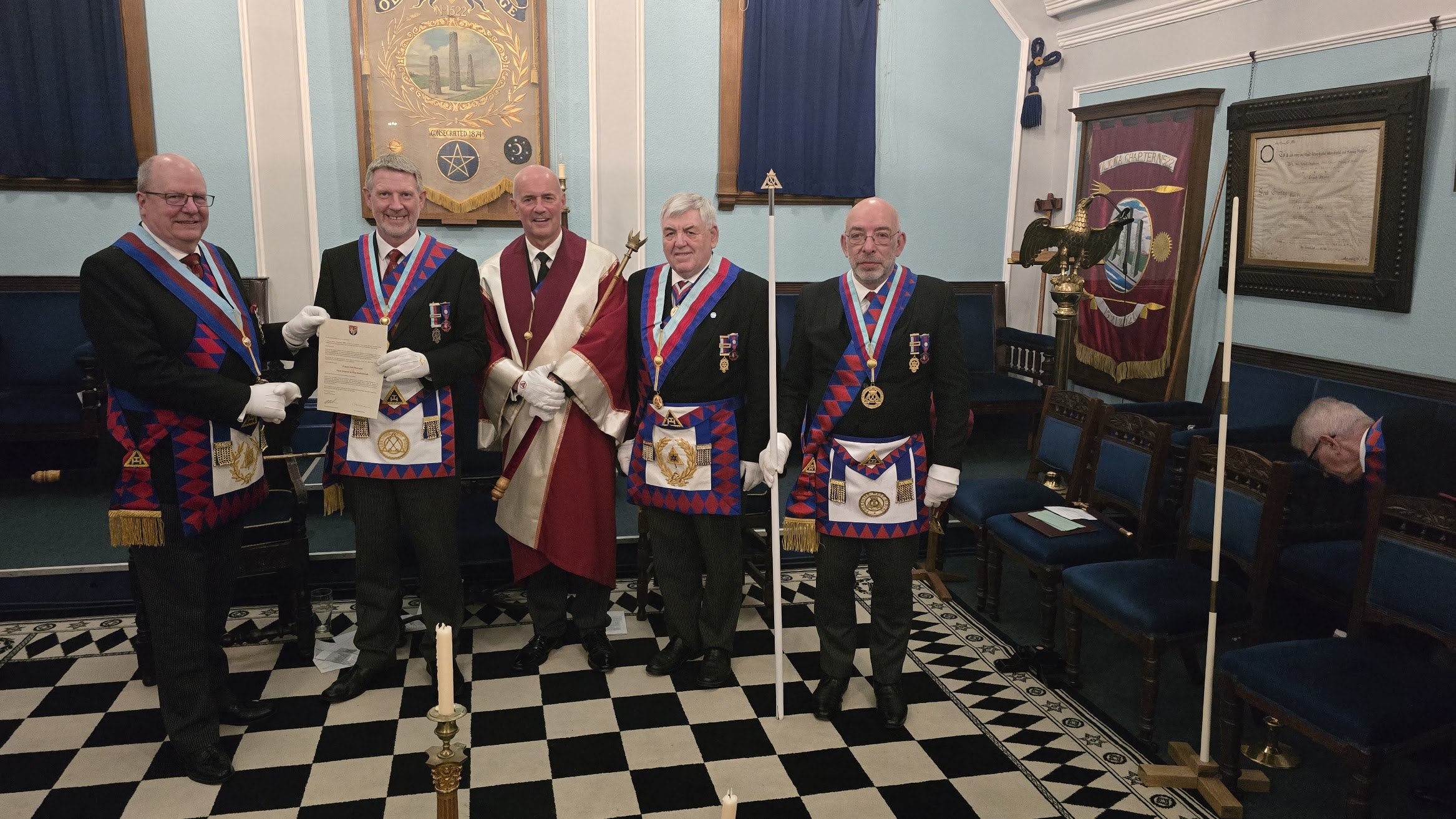 Pictured are the Three Principles, along with Companion Vincent, who was presented with his Supreme Grand Chapter certificate by the esteemed Excellent Companion David Steel, aged 94.